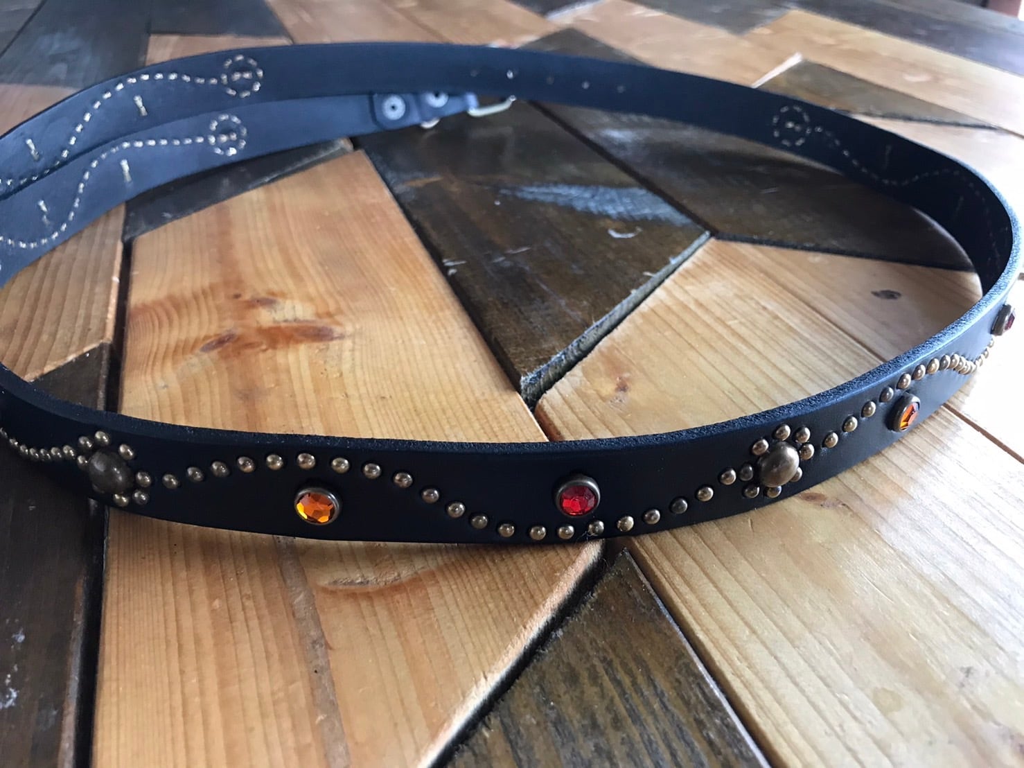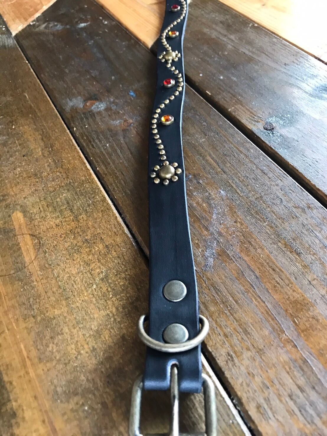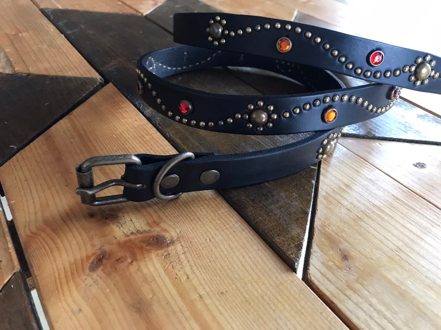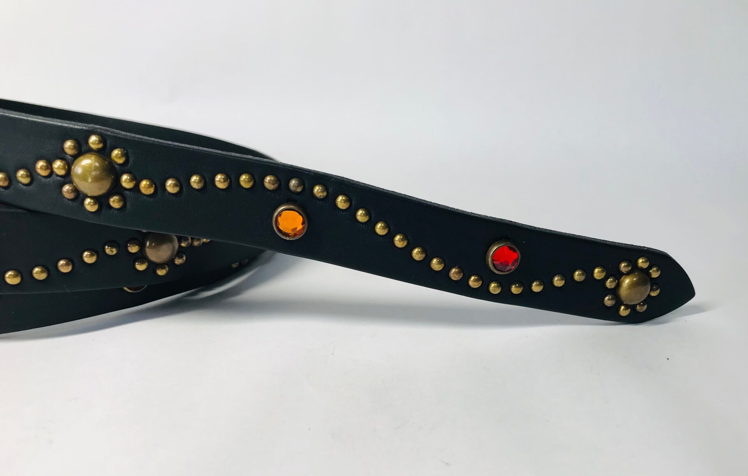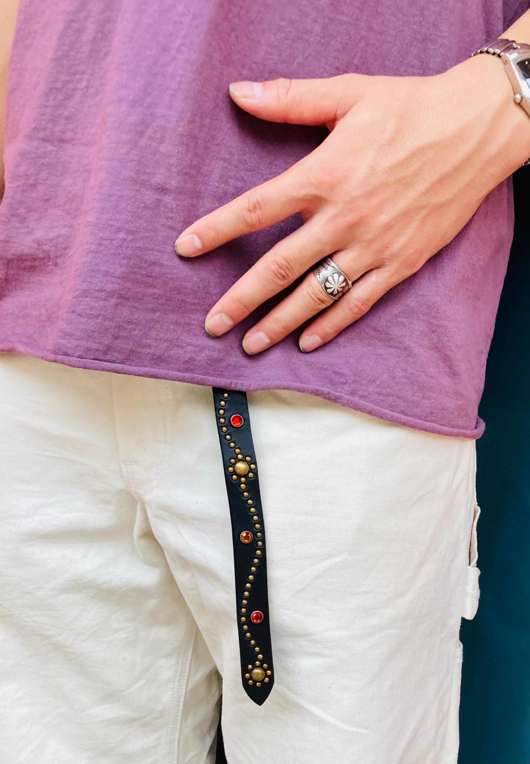 ベルト全面の360度にドットフラワーを施したナローベルト。スタッズ、バックル金具、全てアンティークブラスを使用したALLBRASSモデル。ブラックストーンを使用、バックルの留め具がスナップボタン式ですのでバックルの取り外しが可能です。