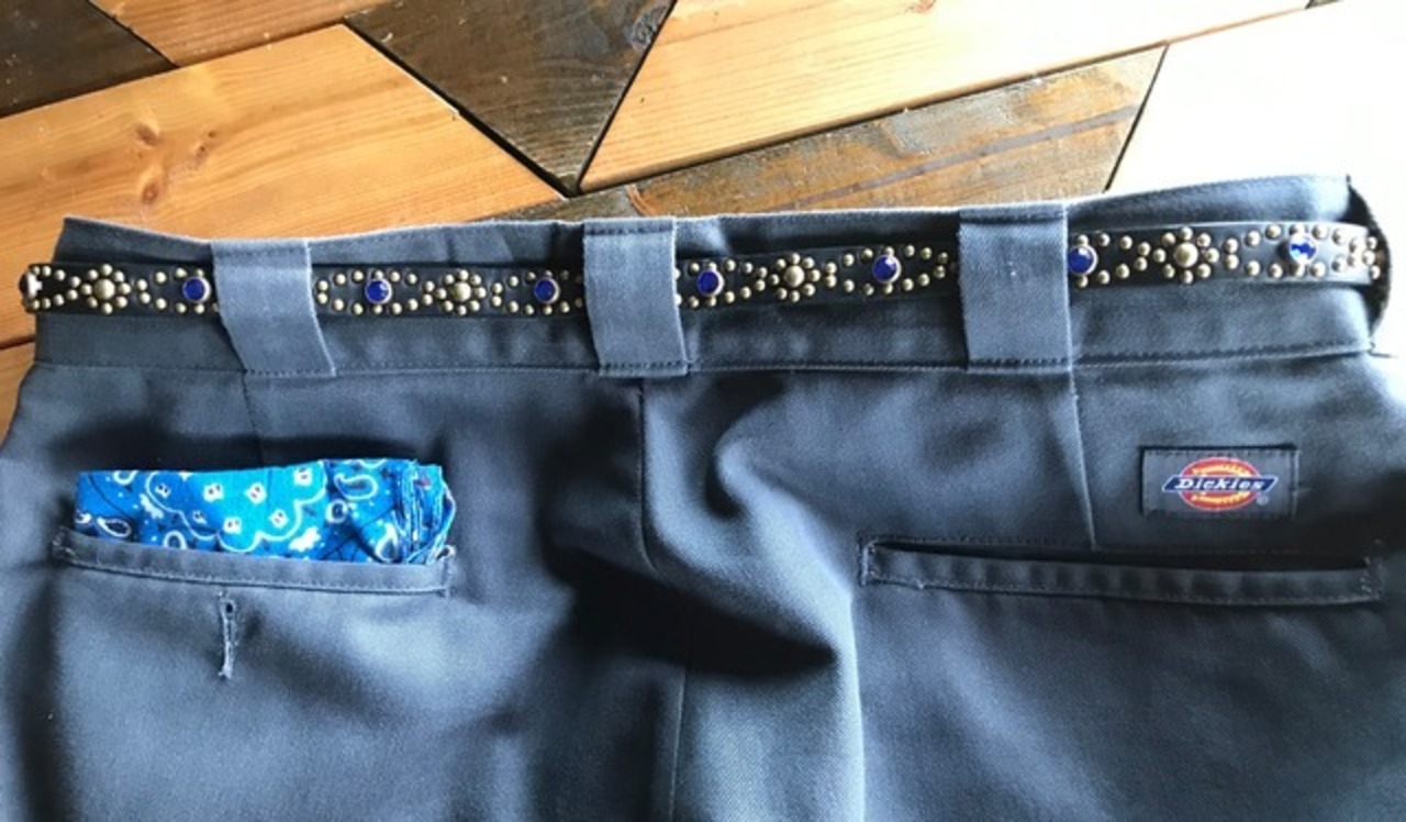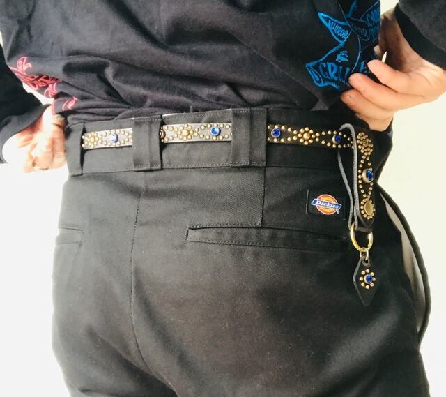 ベルト全面の360度にアンティークブラススタッズを施したナローベルト。バックルもアンティークブラス使用。バックルの留め具がスナップボタン式ですのでバックルの取り外しが可能です。
