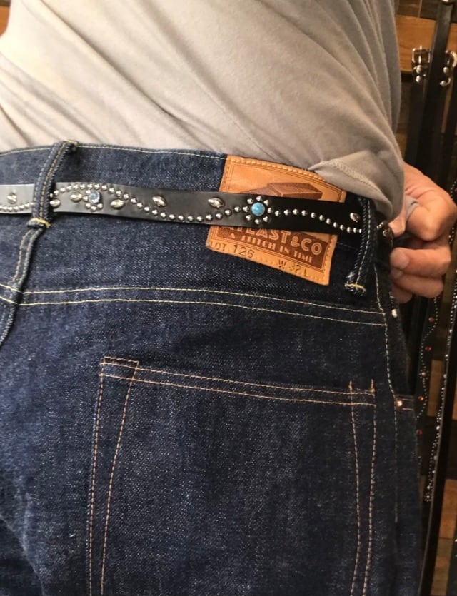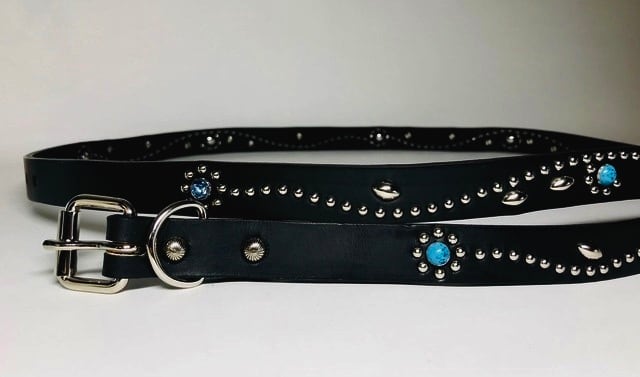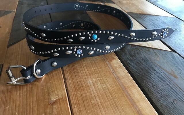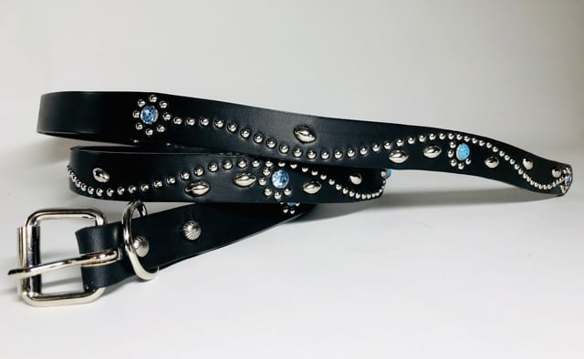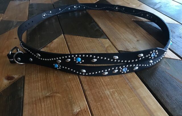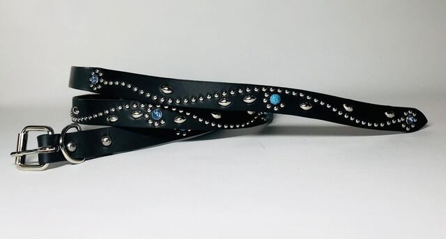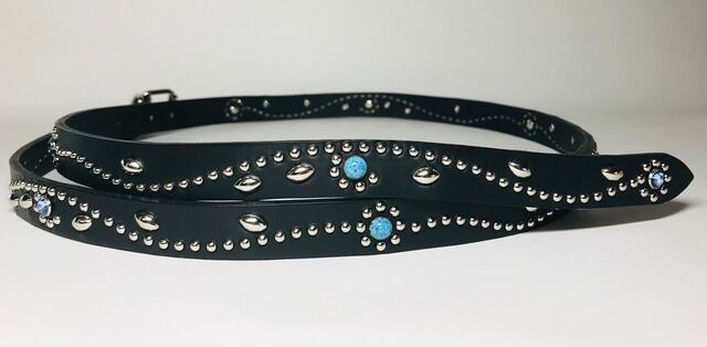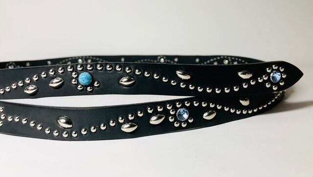 ベルト全面の360度にスタッズを施したナローベルト。クリスタルブルースタッズとターコイズカラースタッズを交互に使用。多面的なカットのクリスタルアクリルストーンは光が当たると美しい輝きを放ちます。