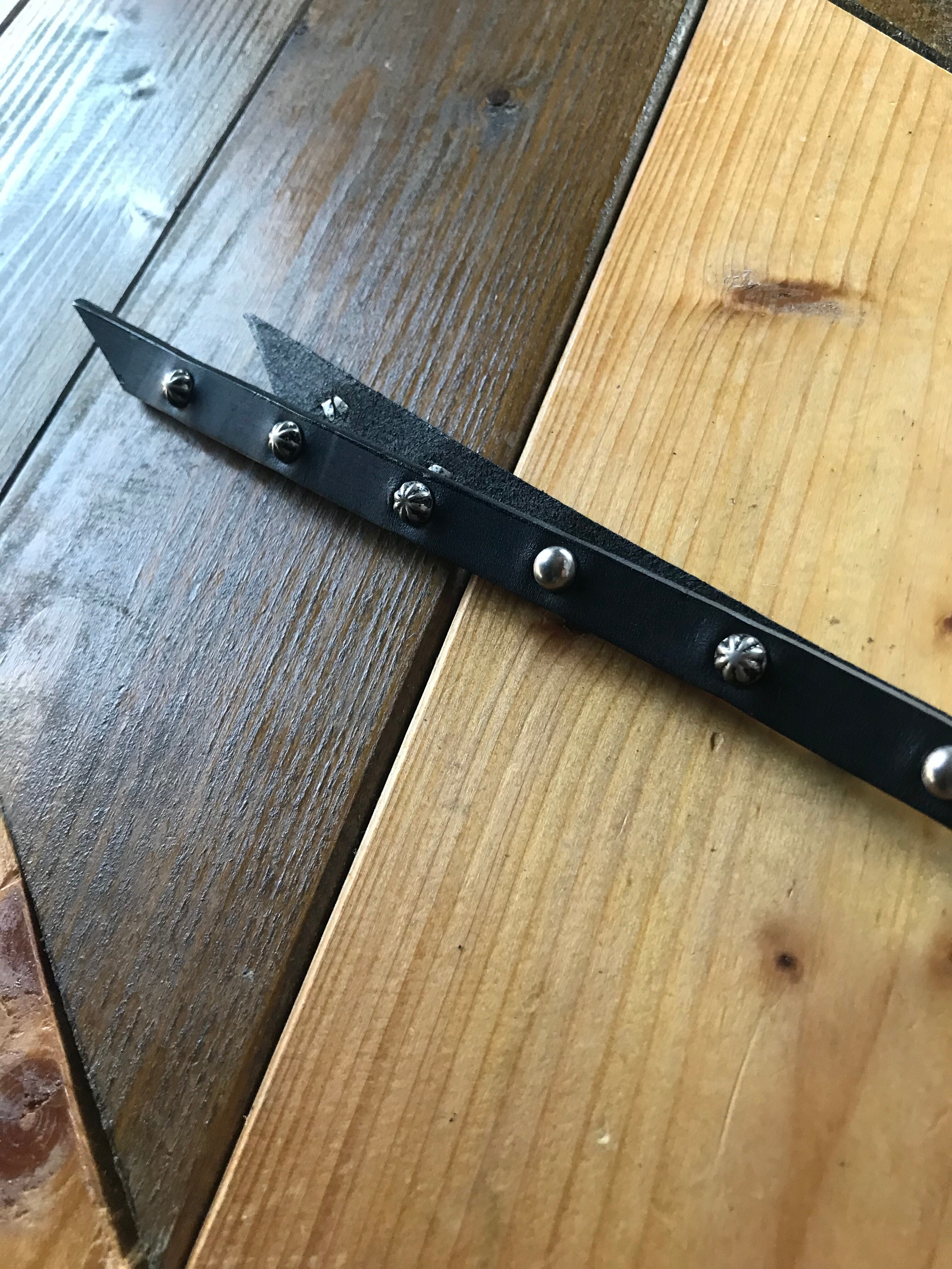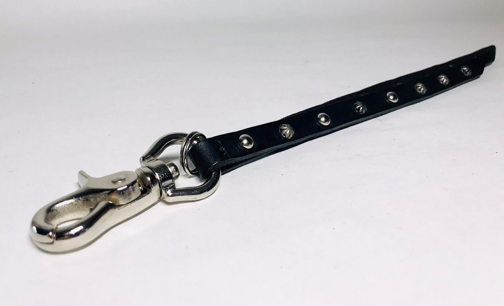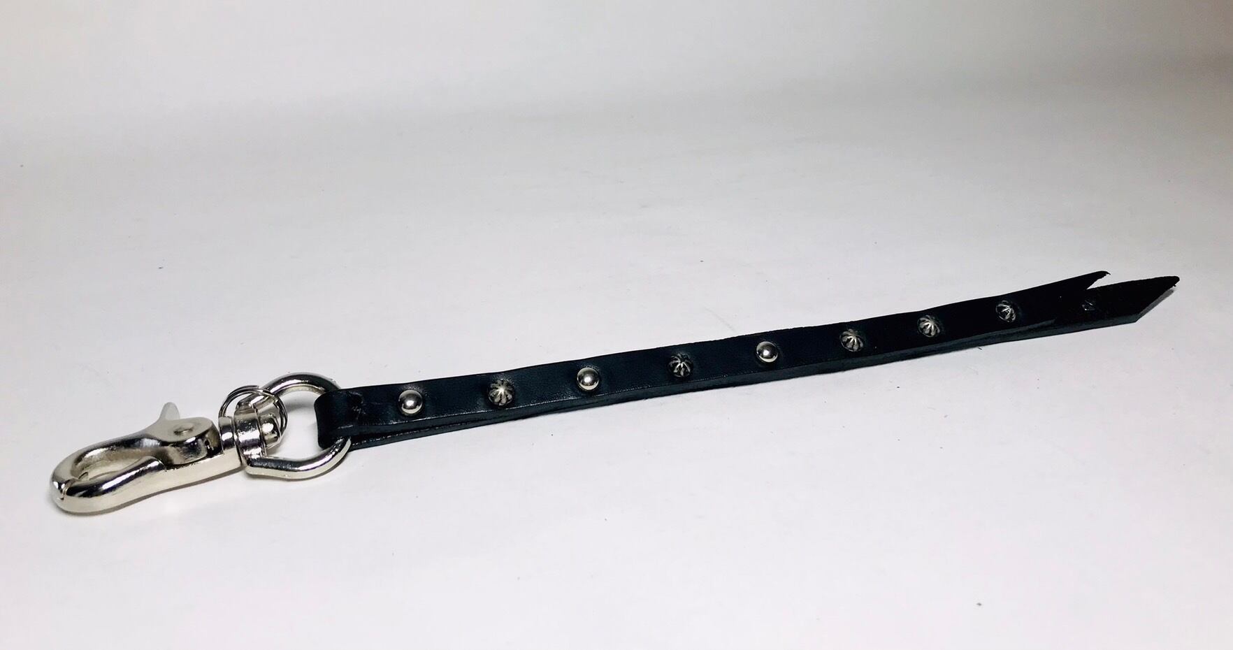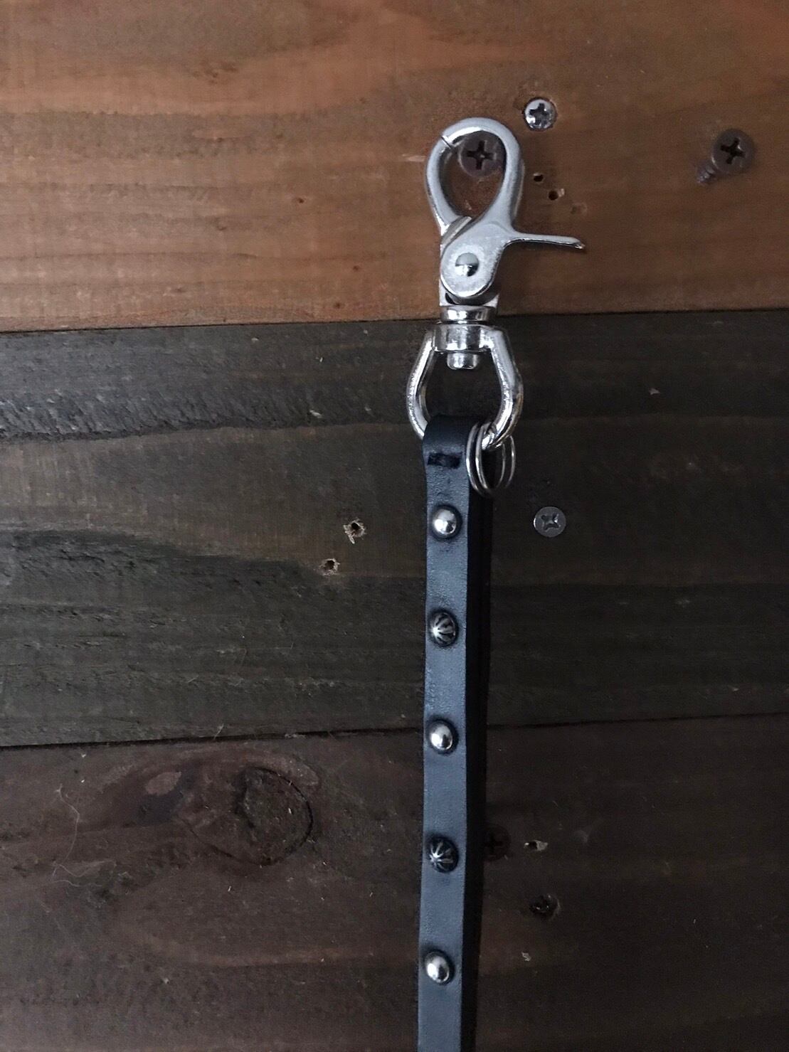 スタッズを両面に施したキーリングは裏表で長さの違うリバーシブルアシンメトリーデザインです。レバー式ナスカンを使用することで取り外しが簡単にでき、ディッーキーズなどベルトループが太めのパンツにも直接取り付けができます。レバー式ナスカンに付属している二重リングへはキーなどを取り付ける事が可能です。