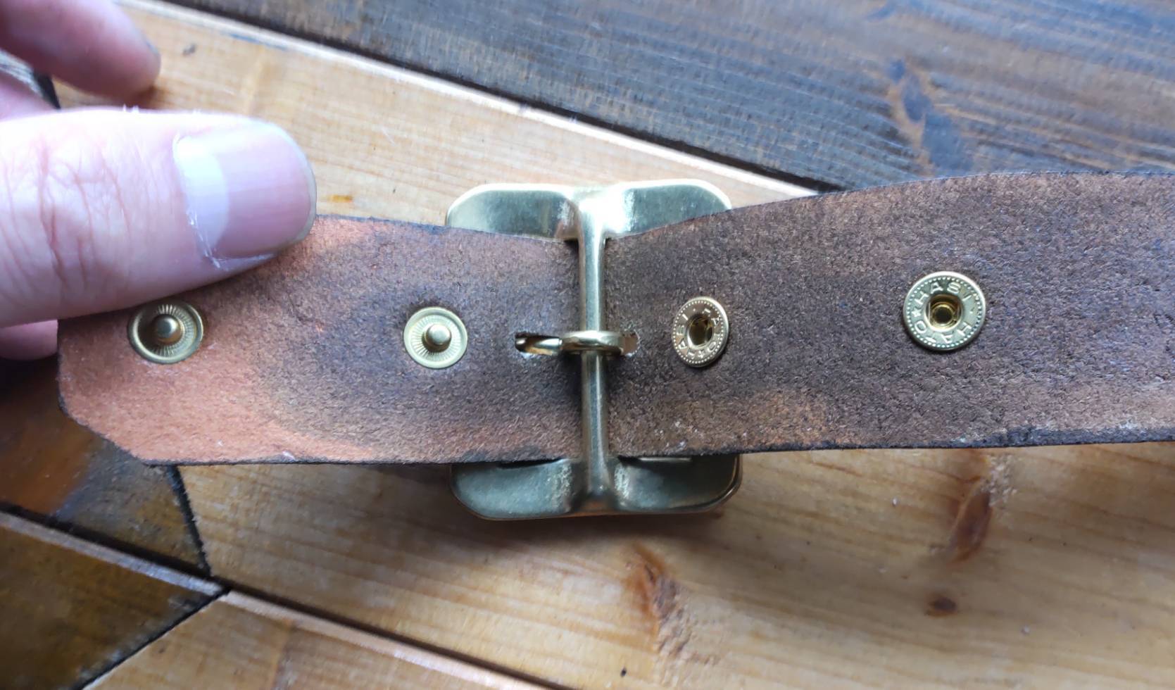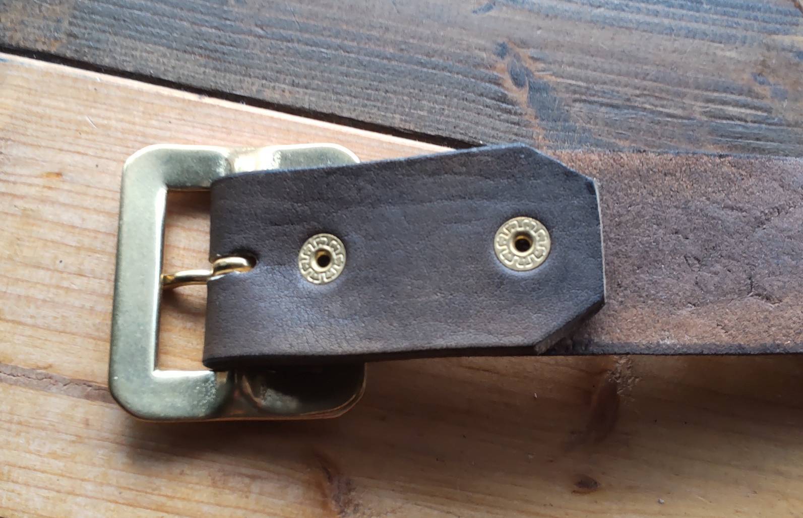 ベルトのケンサキにゴールドブラススタッズ施したモデル。バックルもゴールドブラス製です。バックルの留め具がスナップボタン式ですのでバックルの取り外しや付け替えが簡単行えます。