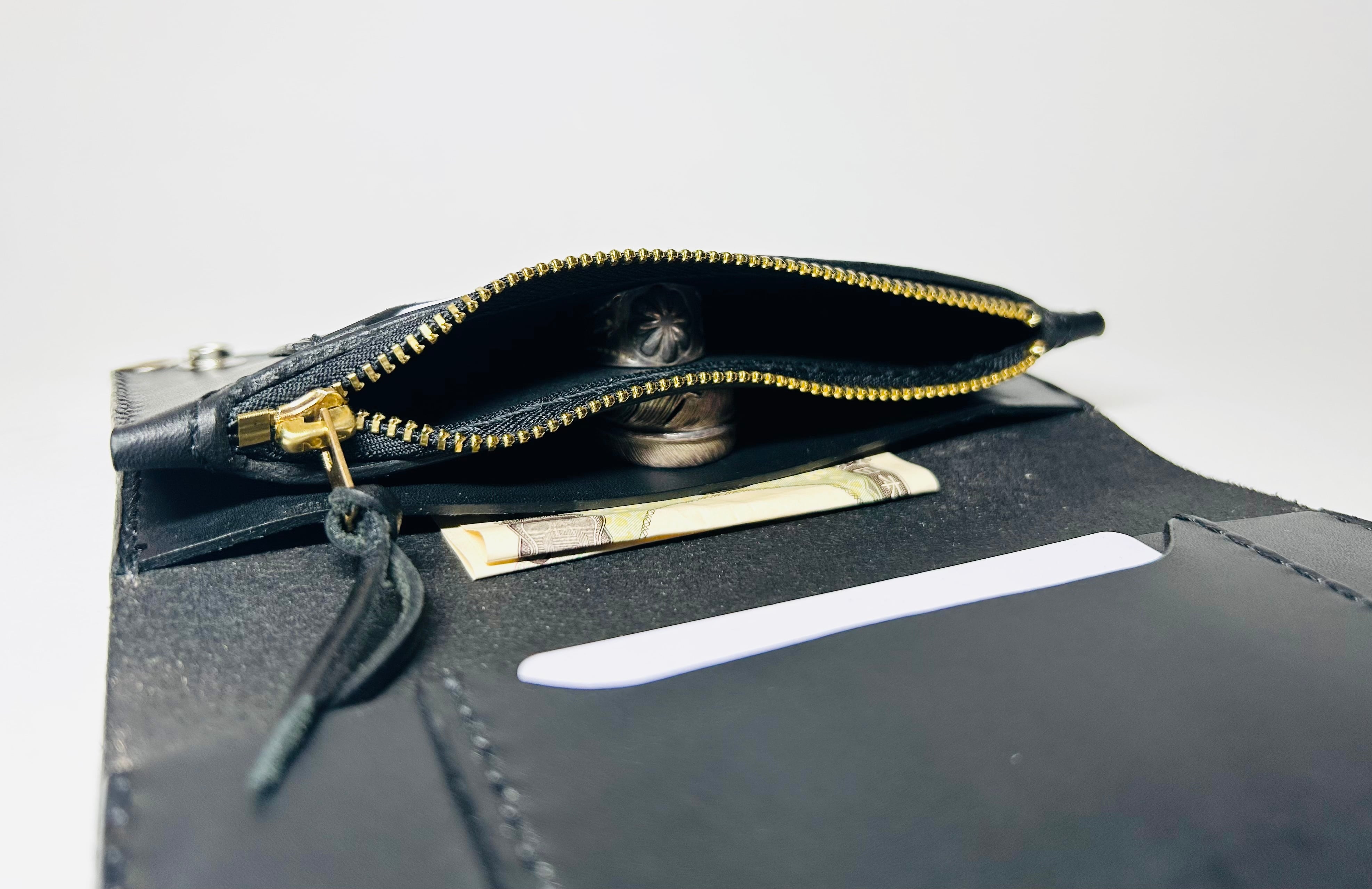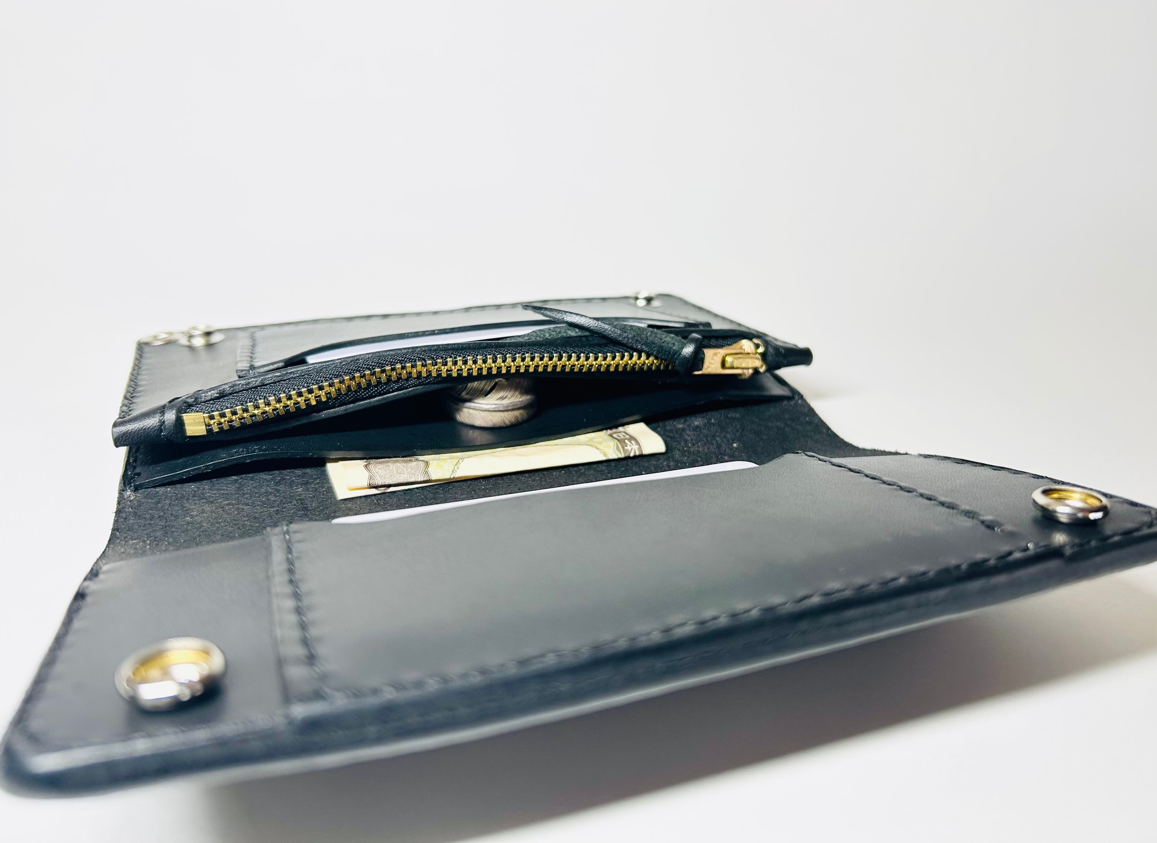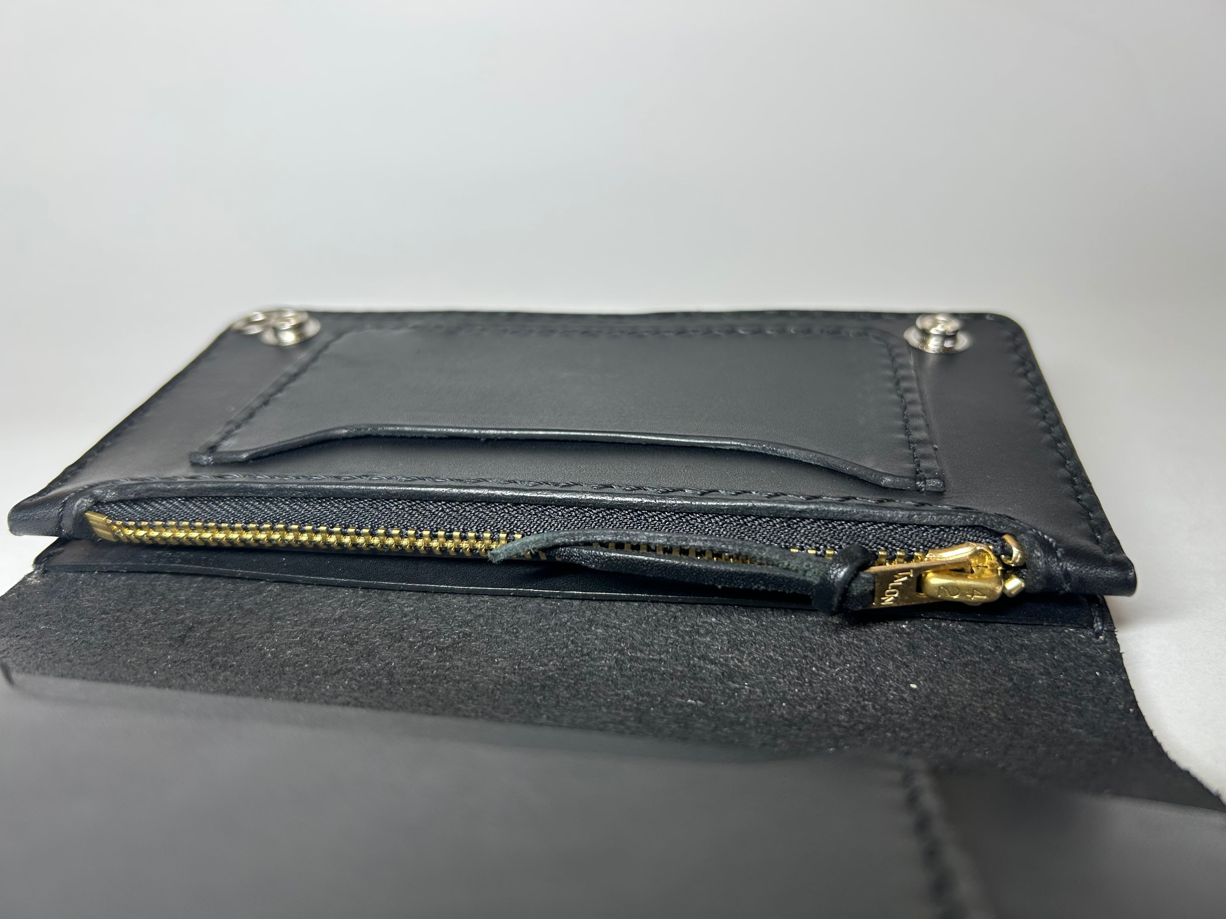 閉じた状態で、縦約9cm横約17cmのトラッカーウォレット。バックポケットに入れた際に少し頭がでるサイズ感です。カード入れはフラップ裏、コインケース部、隠しカード入れ(札入れとコインケースの間)の3箇所ついており各2〜3枚合計9枚ほどカードがはいります。お札は折りたたんだ状態でも10枚以上余裕を持って収納できます。皮革にはサドルレザー【牛革】ジップにはタロンジッパーを使用しています。重厚な使い心地とアンティークな風合いが魅力のタロンジッパーは1960年代にアメリカで誕生し、当時画期的ジッパーとして評された「42Talon」です。