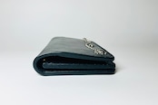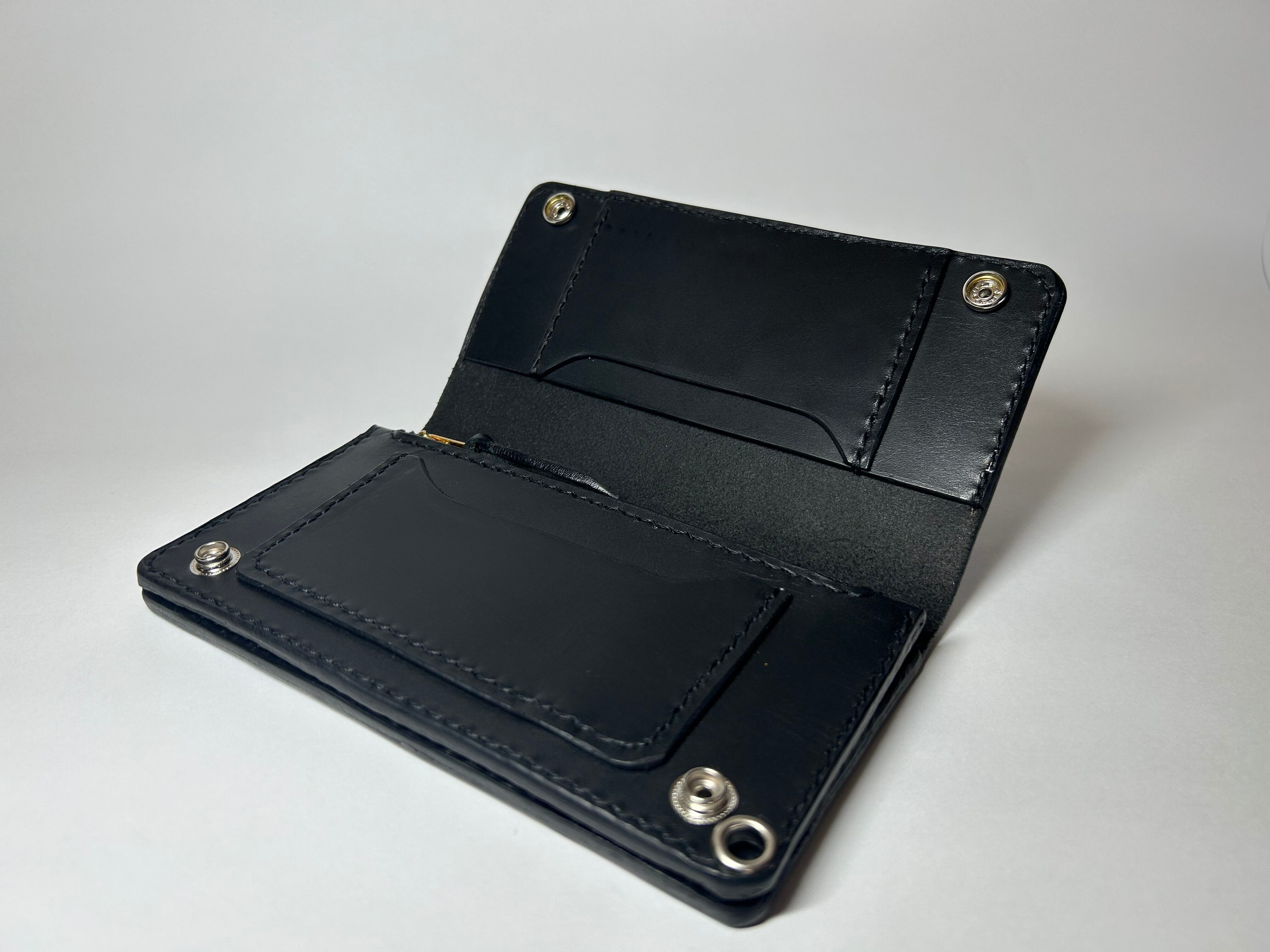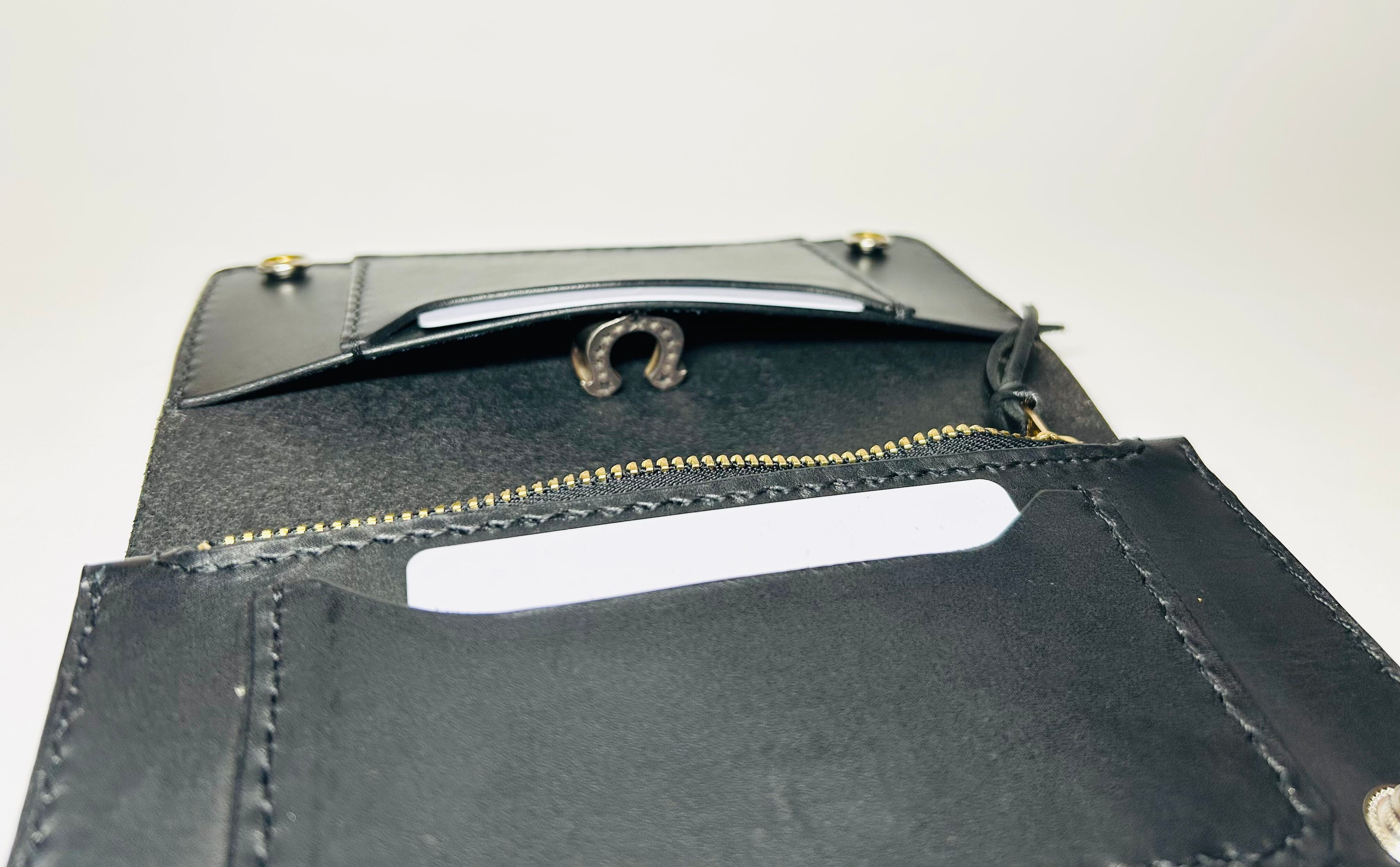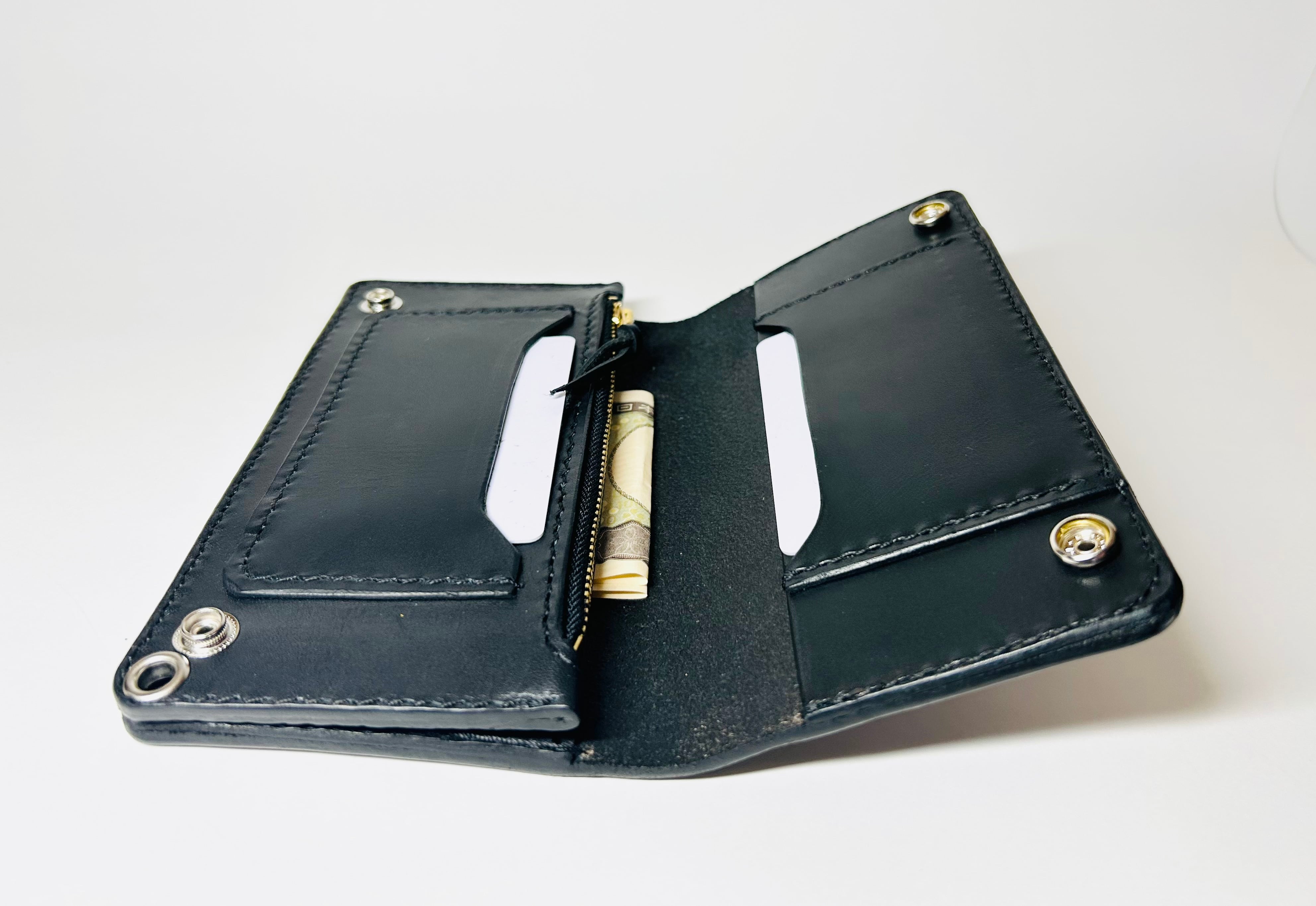 閉じた状態で、縦約9cm横約17cmのトラッカーウォレット。バックポケットに入れた際に少し頭がでるサイズ感です。カード入れはフラップ裏、コインケース部、隠しカード入れ(札入れとコインケースの間)の3箇所ついており各2〜3枚合計9枚ほどカードがはいります。お札は折りたたんだ状態でも10枚以上余裕を持って収納できます。皮革にはサドルレザー【牛革】ジップにはタロンジッパーを使用しています。重厚な使い心地とアンティークな風合いが魅力のタロンジッパーは1960年代にアメリカで誕生し、当時画期的ジッパーとして評された「42Talon」です。