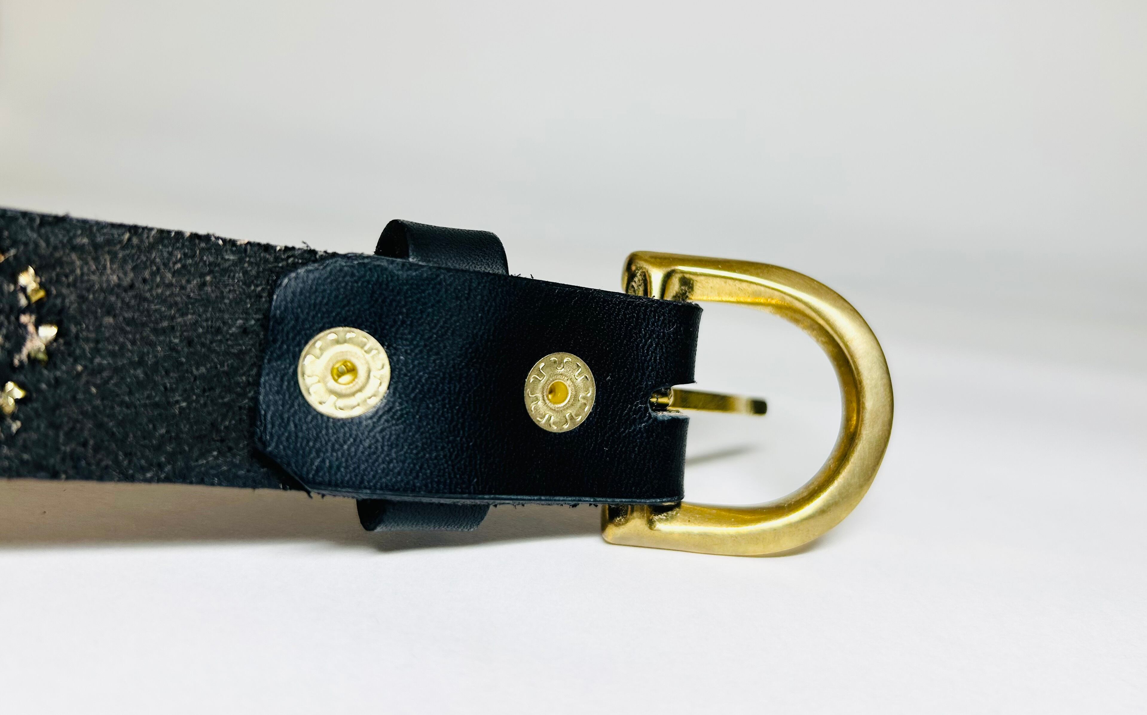 ベルト全面の360度にゴールドバタフライデザインを施したスタッズベルト。ゴールデンは幸運を想像させ、連結し繋がっているバタフライデザインには幸運が続くという意味が込められています。バックルの留め具はスナップボタン式ですので取り外しが可能です。