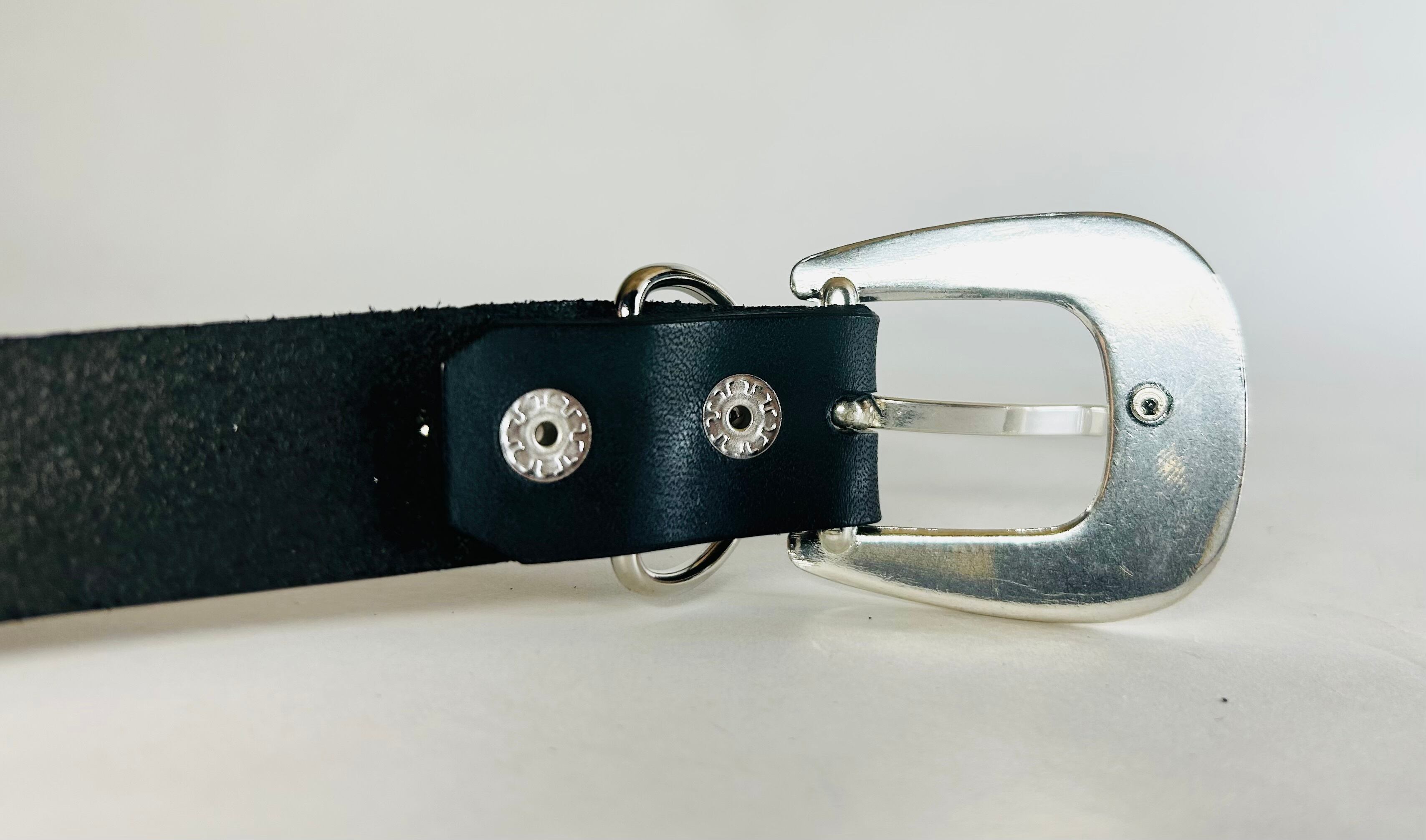 ターコイズスタッズ、ウエスタンバックルを使用した剣先25cmのベルト。画像の剣先の形はシャープです。バックルの留め具はアンブレラスタッズを使用したスナップボタン式なので取り外しが可能です。